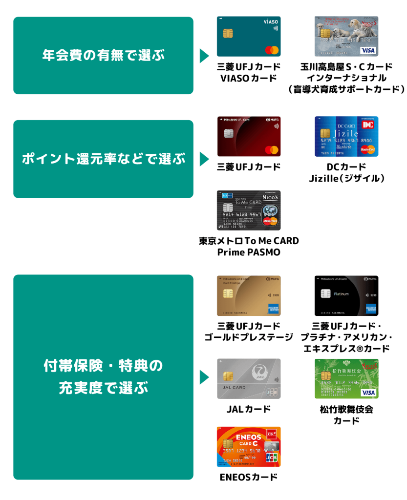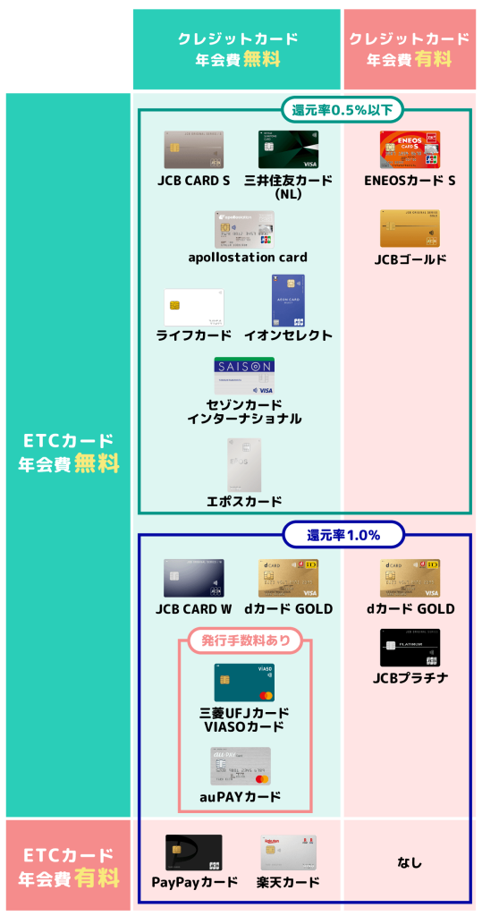 ・クレジットカードとETCカードの年会費や還元率などの情報を比較したマトリックス表