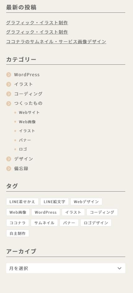 自作したサイドバーを、トップページとお問い合わせページを除くすべてのページで表示しています。