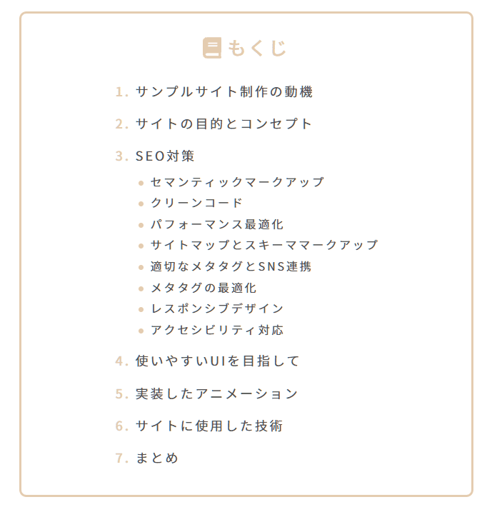 目次は、JavaScriptで実装しました。記事を投稿すると自動的に記事の見出しを目次に反映させる仕組みです。見出し間の階層構造も表現しています。